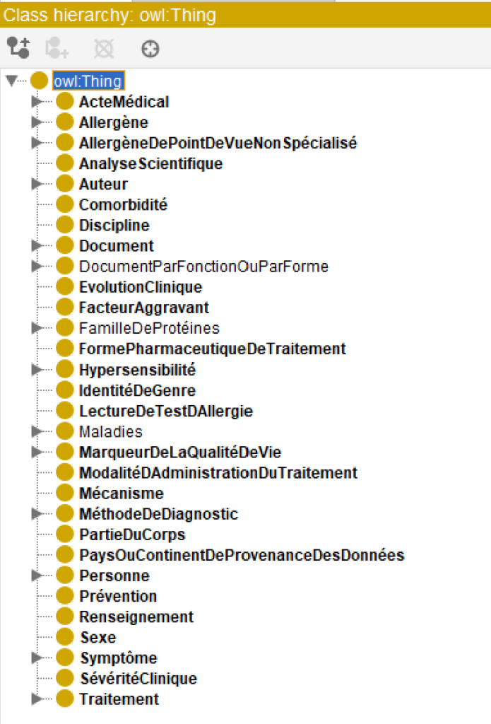 L’ontologie ALLERGIDOC représente les connaissances scientifiques, cliniques et généralistes du domaine de l’allergologie. Elle a été élaborée par Marcin Trzmielewski pour l’Unité d’Exploration des Allergies du CHU de Montpellier (référents : Docteur Davide Caimmi et Prof. Pascal Demoly), dans le cadre d’une thèse en sciences de l’information, de la communication et de la documentation à l’Université Paul Valéry Montpellier 3, financée par la Région Occitanie (France) entre 2019 et 2023. L’ontologie a été élaborée dans une approche constructiviste, à partir d’une analyse des pratiques informationnelles des employés de l’unité d’allergologie et d’une analyse des documents que ces employés utilisent dans leur quotidien. Pour s’informer davantage sur les objectifs et la méthodologies d’élaboration de l’ontologie, consulter la thèse sur : https://theses.hal.science/tel-04310219. La version 3.0 comprend des modifications des versions 1.1 et 2.0 effectuées en février-mars 2025 par Marcin Trzmielewski (LERASS), avec la contribution des étudiantes de la licence professionnelle en documentation : Anne Guerre, Nada Bouhsina, Sabrina Duc et Claire Casasso (Université de Montpellier Paul-Valéry). La version 3.0 contient également une nouvelle structuration au niveau des classes principales (facettes) et d’autres niveaux de profondeur classificatoire. L’analyse à facettes a été basée sur les cibles informationnelles des professionnels d’allergologie et la Descriptive Ontology for Linguistic and Cognitive Engineering (DOLCE). Les concepts, les termes et les relations qui composent l’ontologie sont issus des versions précédentes 1.1 et 2.0, des extractions terminologiques effectuées lors de l’élaboration de la version 1.0, comme des réunions de validation des versions 1.0 et 2.0. Ils proviennent également des systèmes d’organisation des connaissances existants : Ontology for General Medical Science, Information Artifact Ontology, MeSH, SNOMED, LOINC, Allergen Nomenclature, catalogues des allergènes ThermoFisher et Eurofins, site IMAIOS, taxonomies biologiques consultées sur Wikipédia, Gender, Sex, and Sexual Orientation Ontology, et classification d’Eckman.